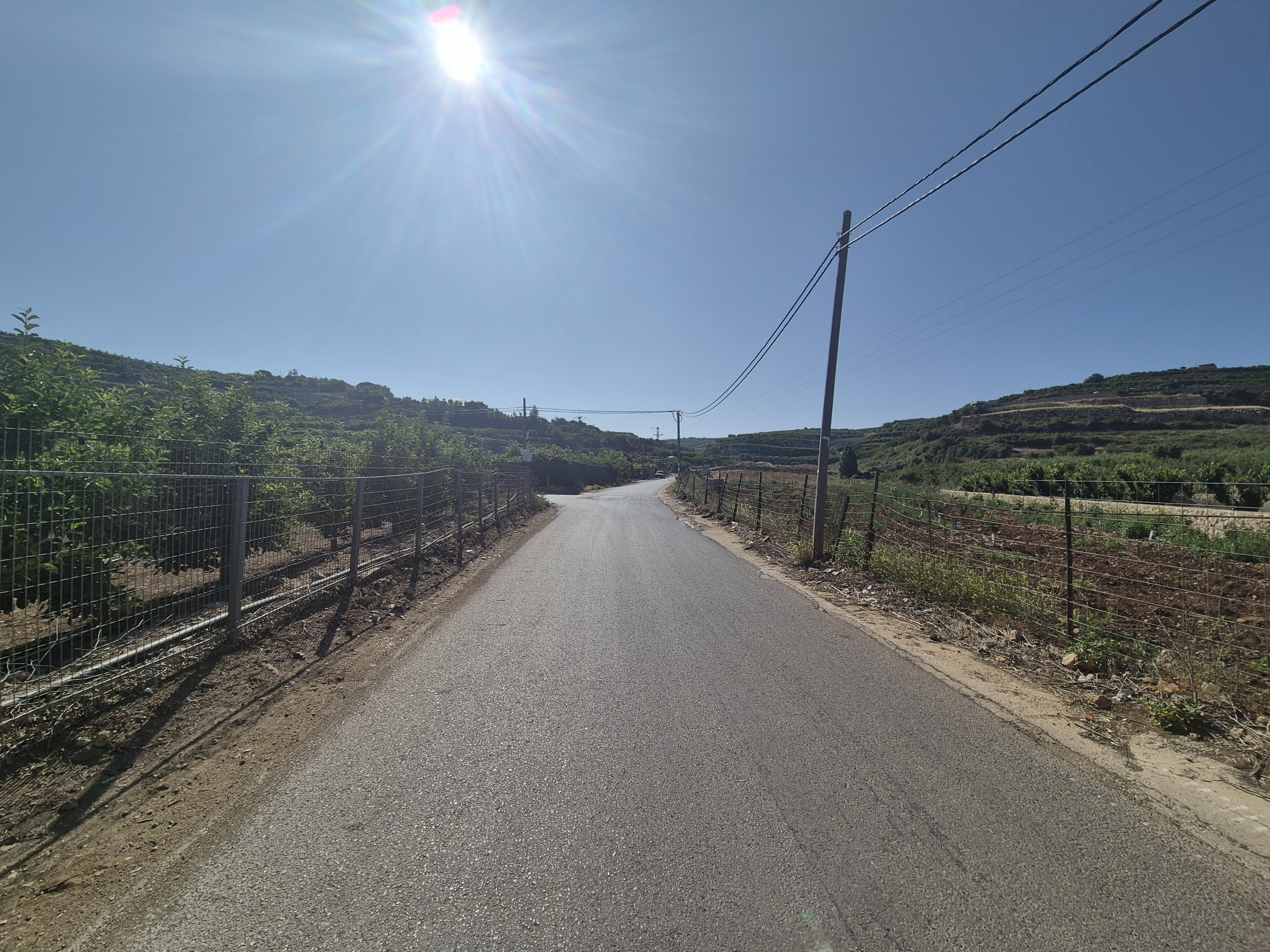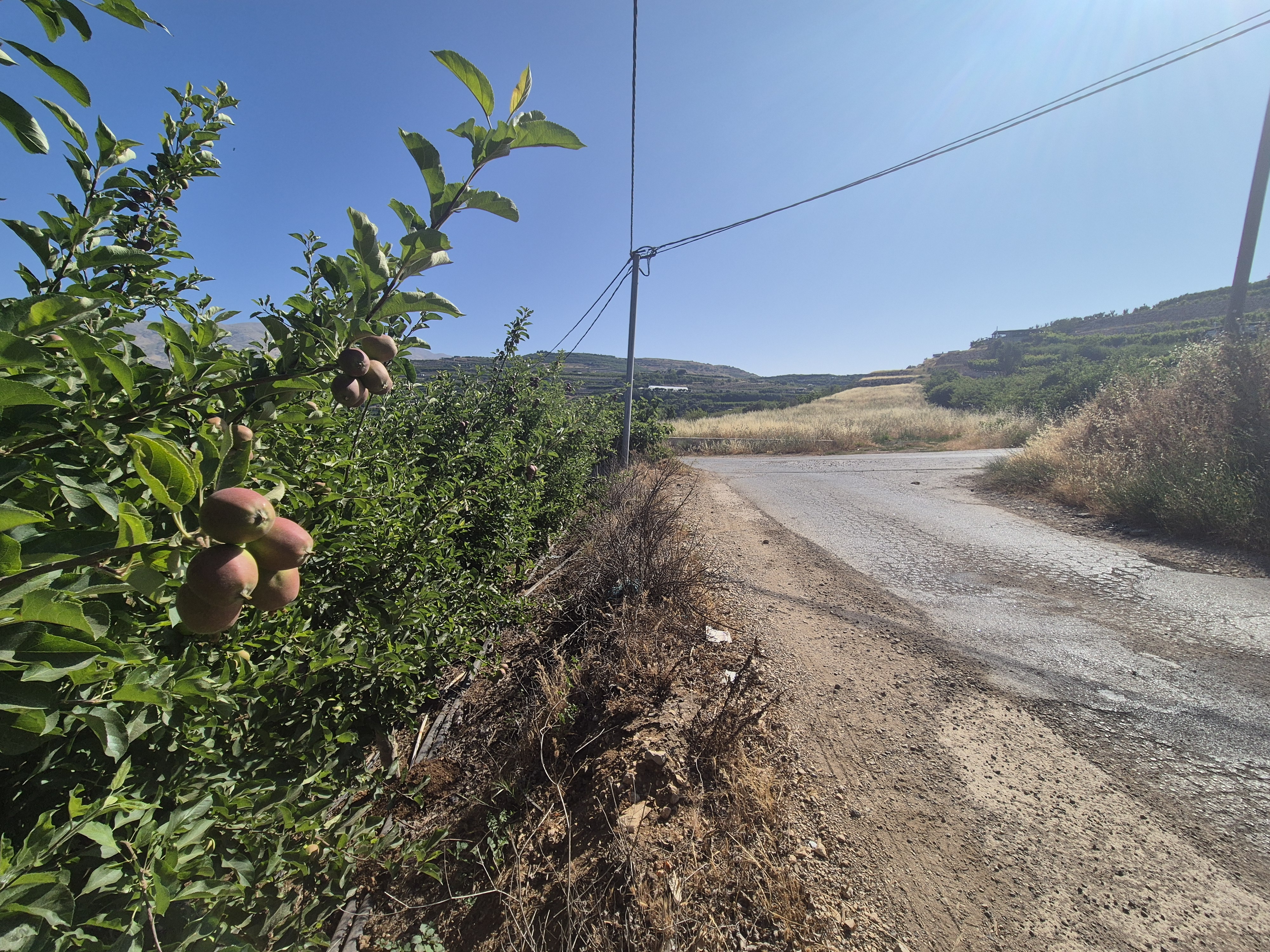 Run uphill in a generally eastward direction, between apple and cherry orchards. After 1.7 km, you will reach a junction—continue straight ahead. After another 500 meters, you will merge onto another road; continue straight (it may look like a left turn at first and then a right).