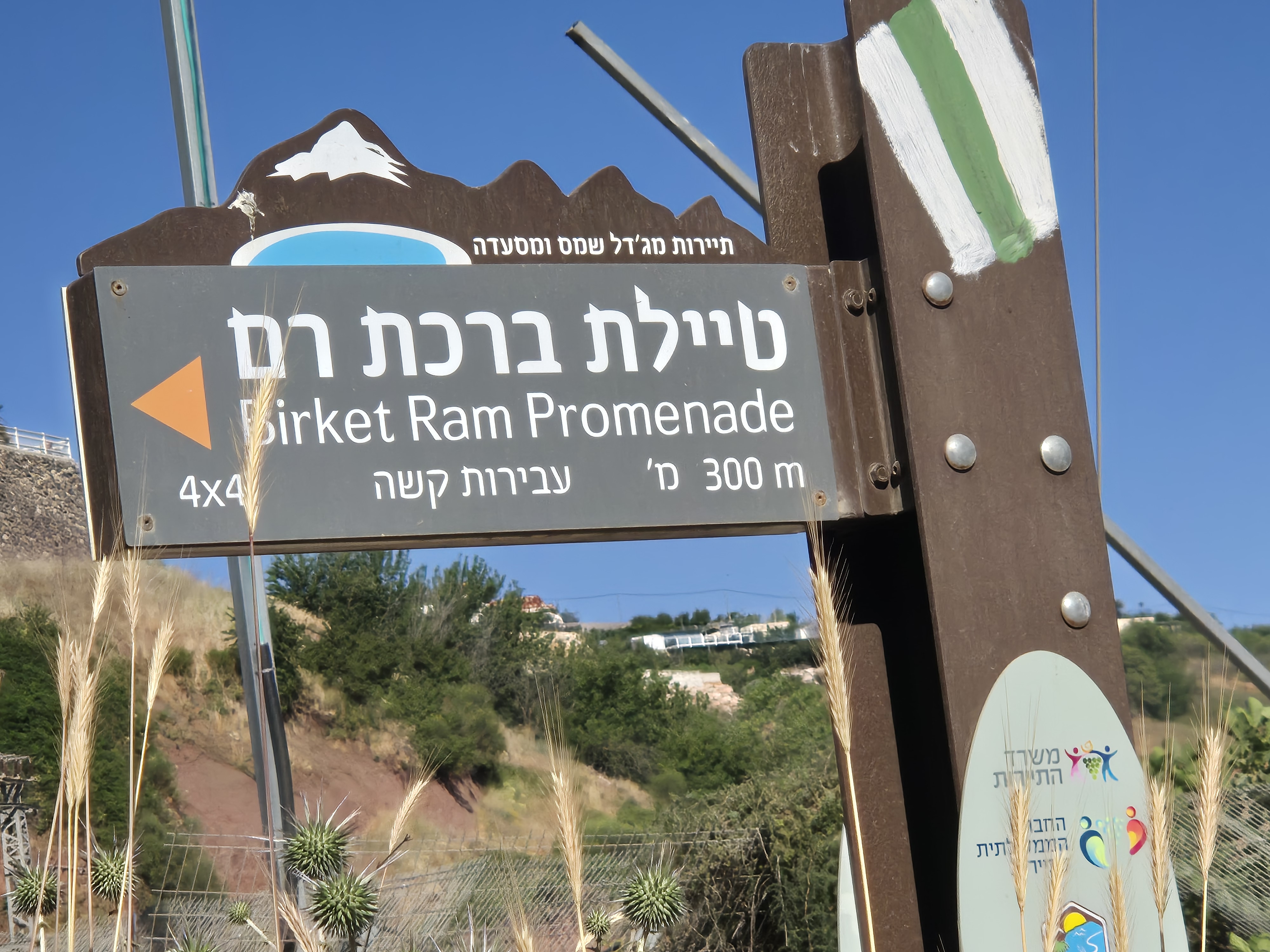 You meet the Golan Trail and turn left onto a dirt road. There is a view of Lake Ram and Mount Hermon, and on the other side, of apple and cherry orchards. The Golan Trail is marked with white, green, and blue trail markers.